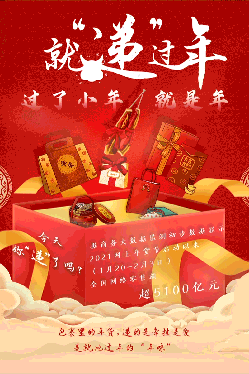 就地過年,年味不減。商務部2月4日發布數據,由商務部等部門指導開展的“2021年全國網上年貨節”,自1月20日啟動以來,全國網絡零售額已超5100億元。“云”購年貨,就“遞”過年,成為人們的新年俗。(記者于佳欣、王雨蕭,設計張晨光)