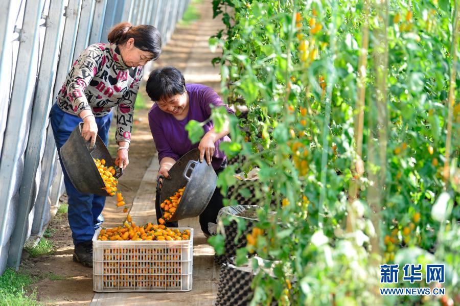 2月2日,在呼和浩特市經濟作物工作站引種試驗示范基地,工作人員收獲越冬茬口感型番茄。新華社發(王正 攝)
