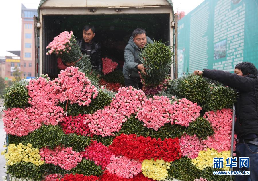 2月9日,商家在昆明斗南花卉市場準備鮮花。新華社發(梁志強 攝)