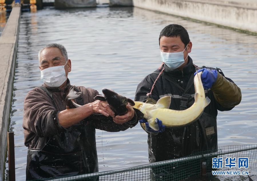 2月4日,河北省井陘縣上坡頭村綠野漁業養殖合作社社員展示剛捕撈的鱘魚。新華社記者 楊世堯 攝