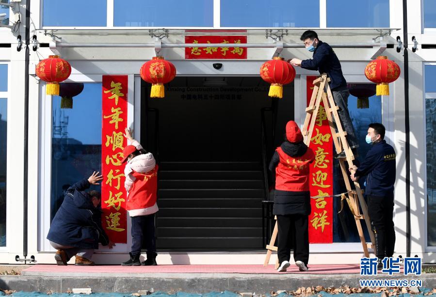 2月6日,在河北省石家莊市橋西區一處工地項目部,志愿者與工人們一起掛燈籠。新華社記者 王曉 攝
