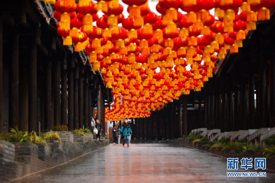 重慶市酉陽土家族苗族自治縣酉州古城街道上掛起了紅燈籠(2月10日攝)。新華社發(陳碧生 攝)