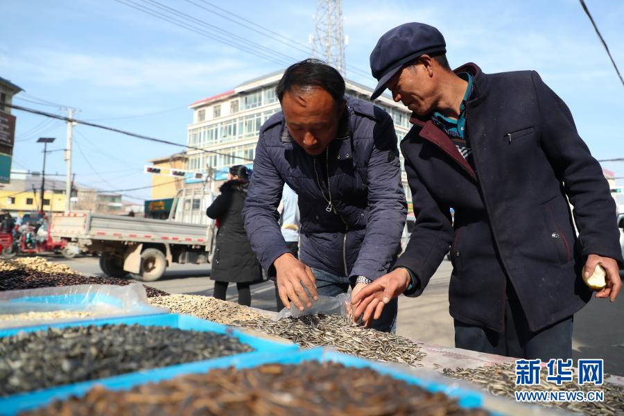 2月7日,在甘肅省定西市渭源縣會川鎮集市上,元古堆村村民曾玉成(右)在置辦年貨。 新華社記者 馬希平 攝
