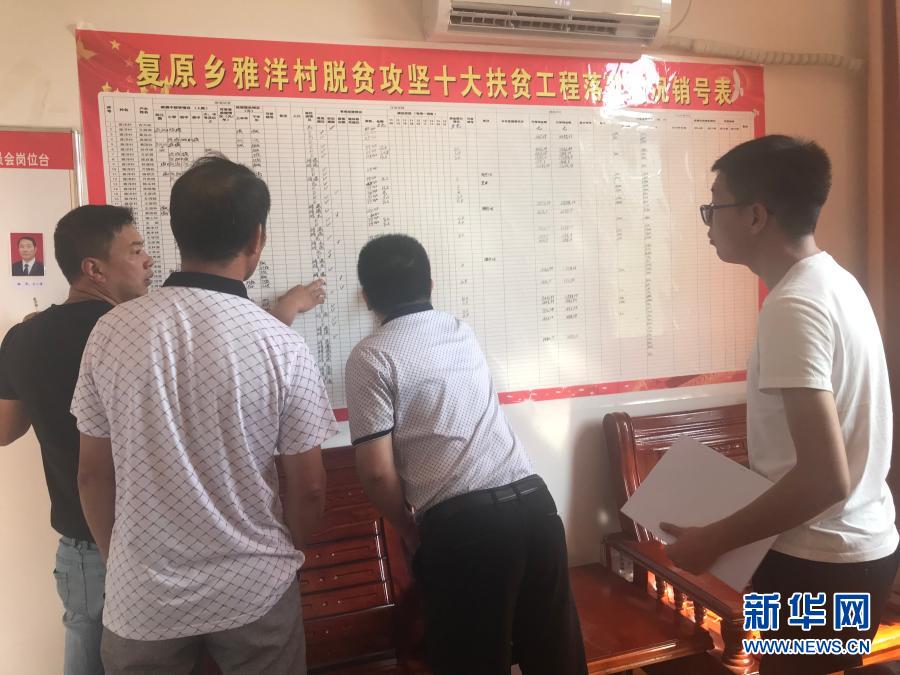 吳應(yīng)譜(右一)在雅洋村和同事研究扶貧工程落實情況(資料圖片)。新華社發(fā)(修水縣委宣傳部供圖)