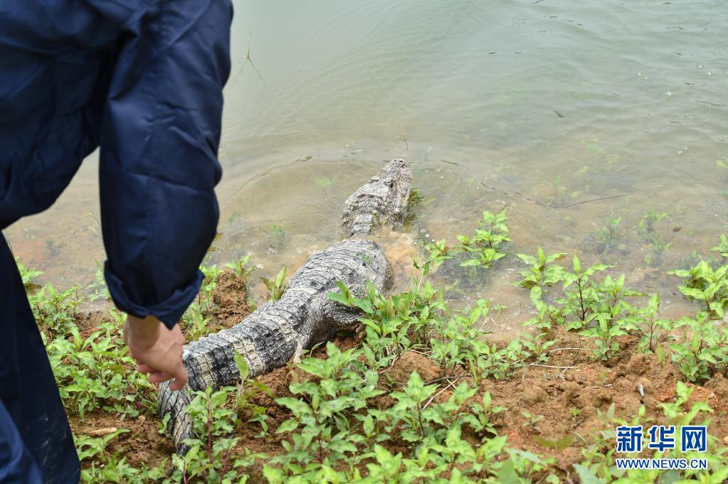 5月13日,工作人員放歸揚子鱷。當日,安徽揚子鱷國家級自然保護區在涇縣雙坑片區揚子鱷核心棲息地放歸51條人工繁育揚子鱷。 新華社記者 韓旭 攝