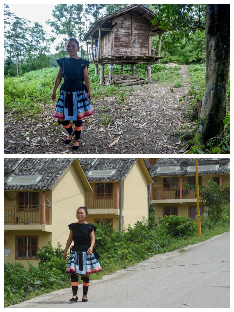 拼版照片:上圖為貴州黔南布依族苗族自治州荔波縣瑤山瑤族鄉(xiāng)村民謝三英從舊居的小路旁經過,下圖為謝三英從瑤山瑤族鄉(xiāng)拉片移民新村的公路旁經過(2017年8月8日攝)。新華社記者歐東衢攝