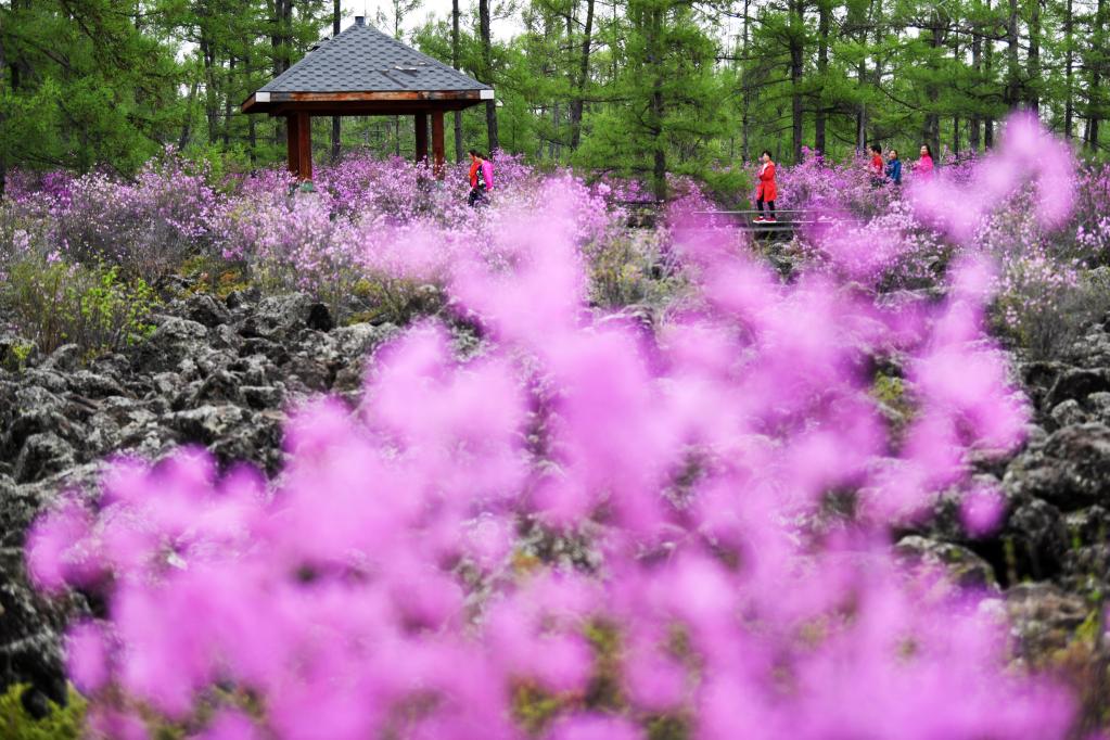 游客在伊春紅星火山地質公園欣賞杜鵑花(2019年5月13日攝)。新華社記者王建威攝