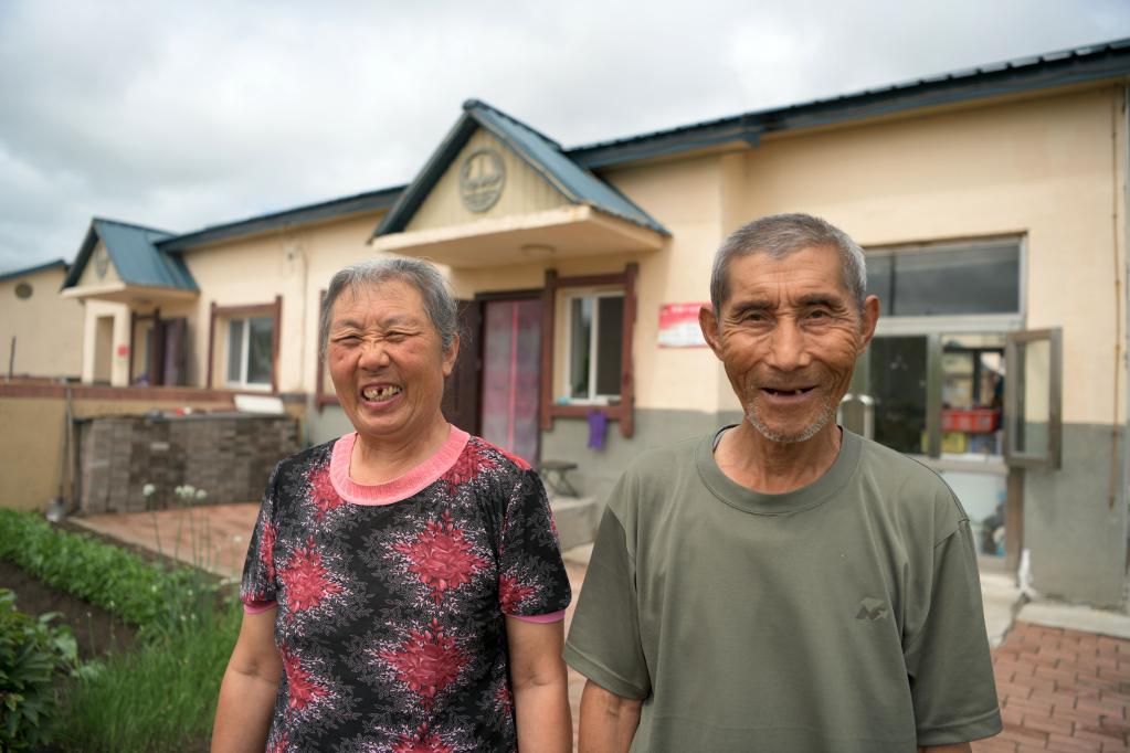八岔村赫哲族脫貧戶劉永全(右)與老伴周洪香在赫哲新區的自家住房前合影(2020年7月21日攝)。新華社記者王建威攝