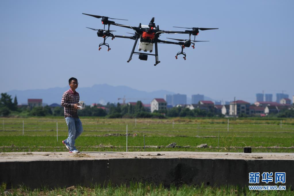 工作人員在湖南省益陽市赫山區米香村的稻田旁操控無人機給晚稻打藥(2020年7月23日攝)。新華社記者 薛宇舸 攝