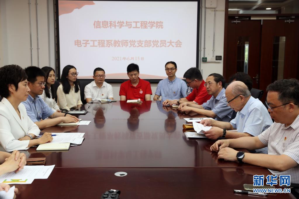 6月15日,在復(fù)旦大學(xué)信息科學(xué)與工程學(xué)院電子工程系教師黨支部黨員大會(huì)上,已成為中共預(yù)備黨員的陳振新(左)發(fā)言。新華社記者 劉穎 攝