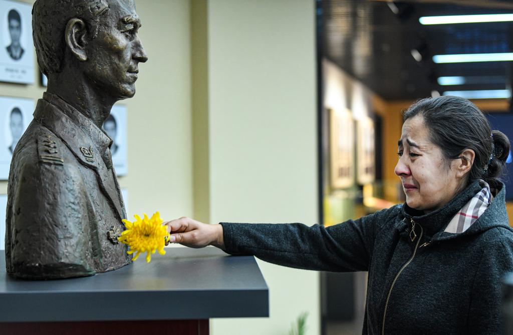 2021年4月3日,在新疆警史館,瑪依努爾在愛人艾熱提的雕像前擺上菊花。新華社記者 王菲 攝