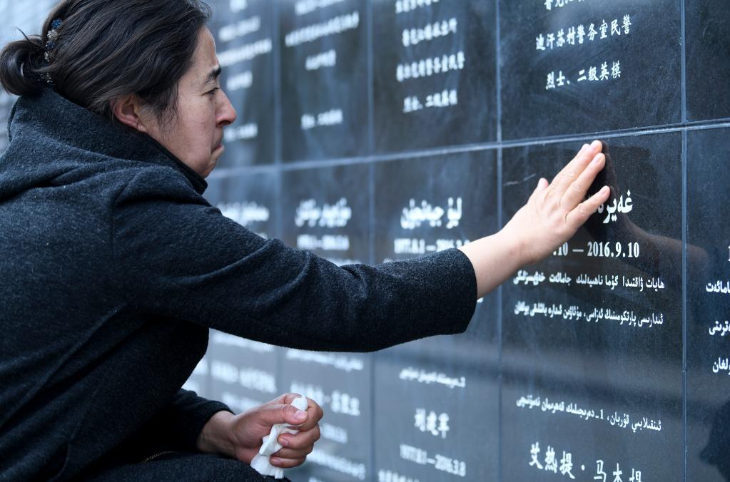 2021年4月3日,在烏魯木齊市革命烈士陵園,瑪依努爾撫摸鐫刻在新疆公安英烈紀念碑上愛人艾熱提的名字。新華社記者 王菲 攝