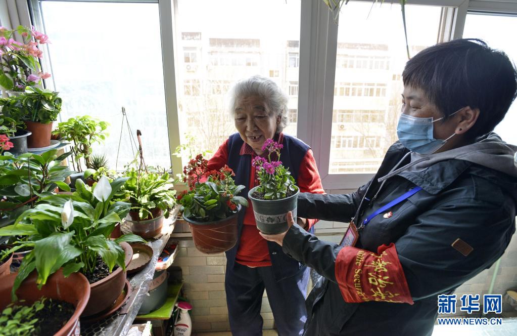 北京市豐臺區東高地街道黨員志愿者馮春紅(右)上門看望社區內高齡老人王康鳳,了解老人居家生活情況(2020年4月1日攝)。新華社記者 李欣 攝