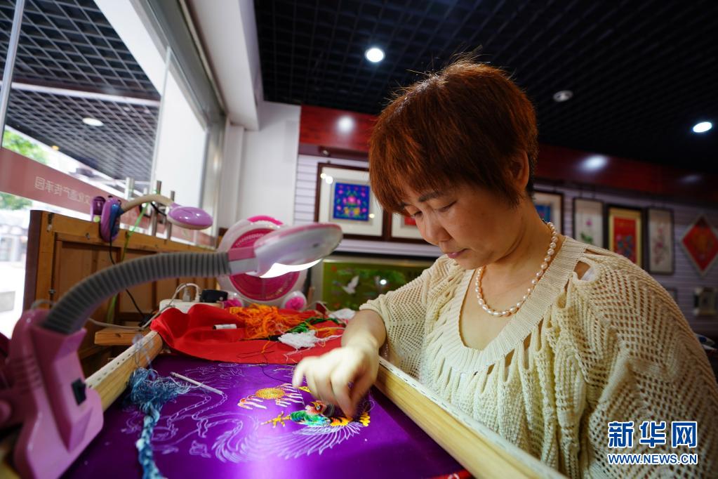 武漢市漢陽區江欣苑社區居民在進行非遺刺繡創作(7月18日攝)。新華社記者 邢廣利 攝
