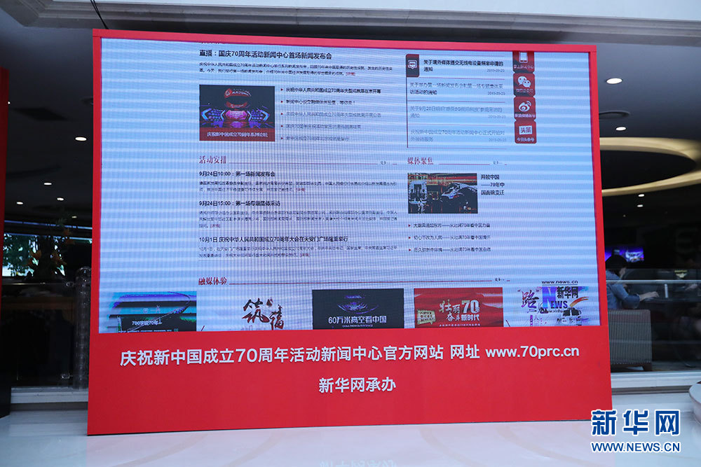 9月24日,慶祝中華人民共和國成立70周年活動(dòng)新聞中心在北京梅地亞中心二層新聞發(fā)布廳舉辦第一場新聞發(fā)布會(huì)。圖為新聞中心現(xiàn)場。新華網(wǎng) 雷東瑞 攝