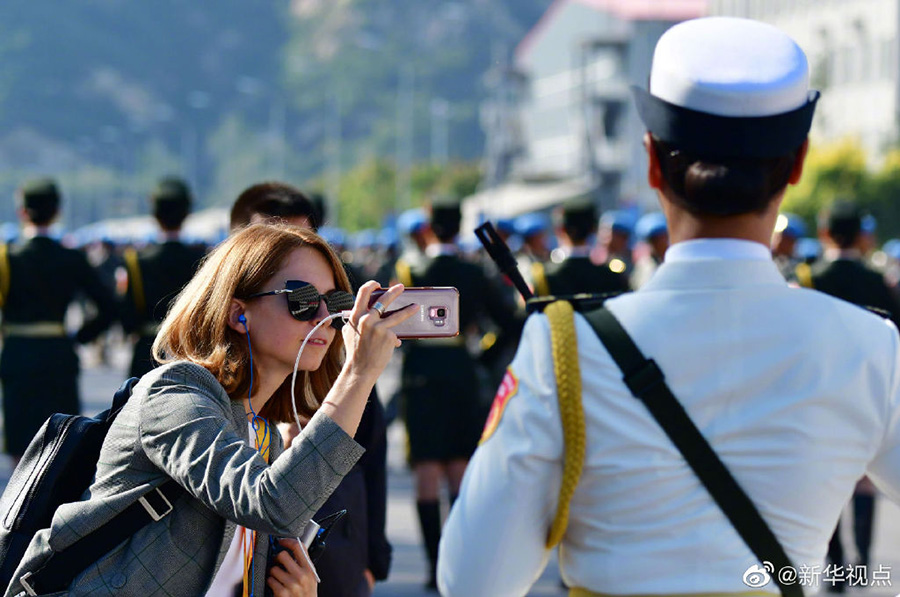 觀摩徒步方隊和聯合軍樂團訓練,參觀閱兵部隊宿舍,與儀仗方隊和維和部隊方隊官兵對話……閱兵集訓點有啥故事?快來跟著中外記者一探究竟?(新華社記者 魏培全 攝)