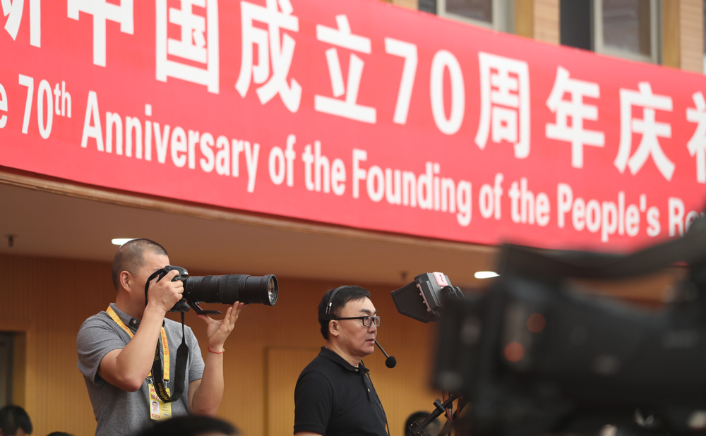 9月27日,慶祝中華人民共和國成立70周年活動新聞中心在梅地亞中心二層新聞發布廳舉辦第三場新聞發布會,中央農村工作領導小組辦公室主任、農業農村部部長韓長賦,國務院扶貧開發領導小組辦公室主任劉永富介紹全面建成小康社會,扎實推進脫貧攻堅和鄉村振興,并回答記者提問。圖為采訪拍攝發布會的記者。新華網 陳杰 攝