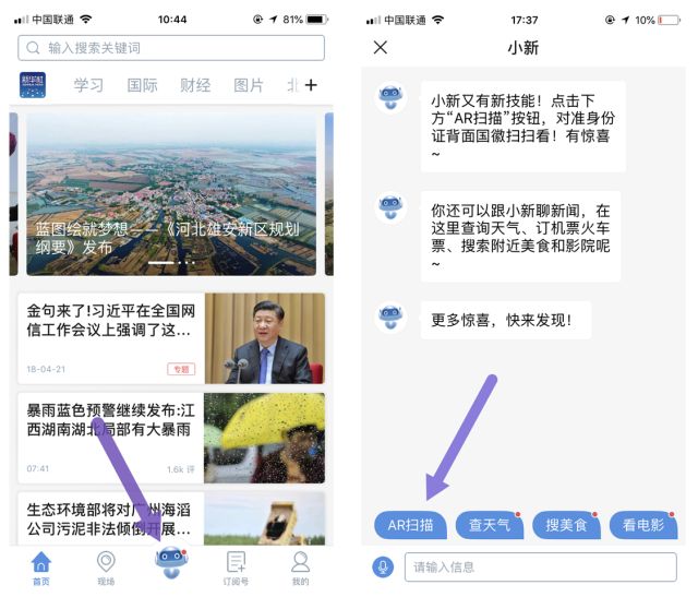 只要點擊新華社客戶端首頁下方的“小新機器人”,使用“AR功能”掃描二代身份證帶有國徽和長城圖案的一面,就可以隨時和新華社記者一起出發。