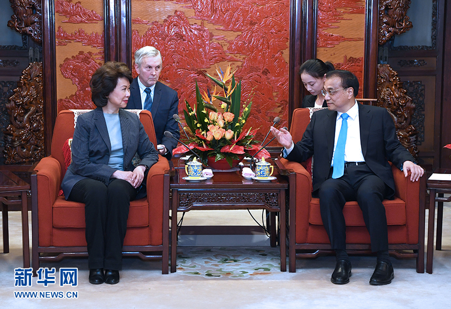 新華社北京4月26日電(記者白潔)國(guó)務(wù)院總理李克強(qiáng)26日下午在中南海紫光閣會(huì)見(jiàn)來(lái)華訪問(wèn)并出席中美交通論壇第九次會(huì)議的美國(guó)運(yùn)輸部長(zhǎng)趙小蘭。
