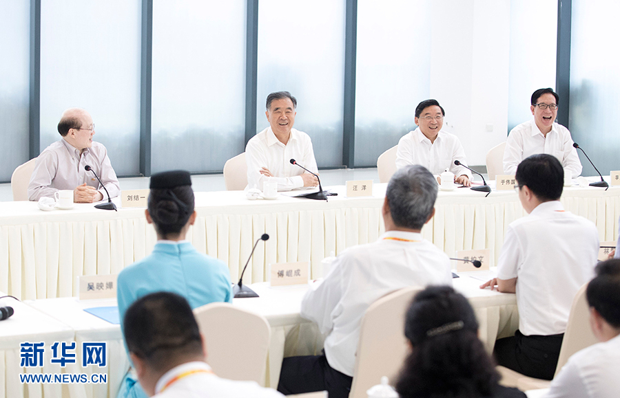 6月6日至7日,中共中央政治局常委、全國政協主席汪洋在廈門出席第十屆海峽論壇期間,就兩岸經濟文化交流合作情況進行調研。這是6月6日,汪洋與在閩工作的臺灣同胞代表座談。新華社記者 王曄 攝