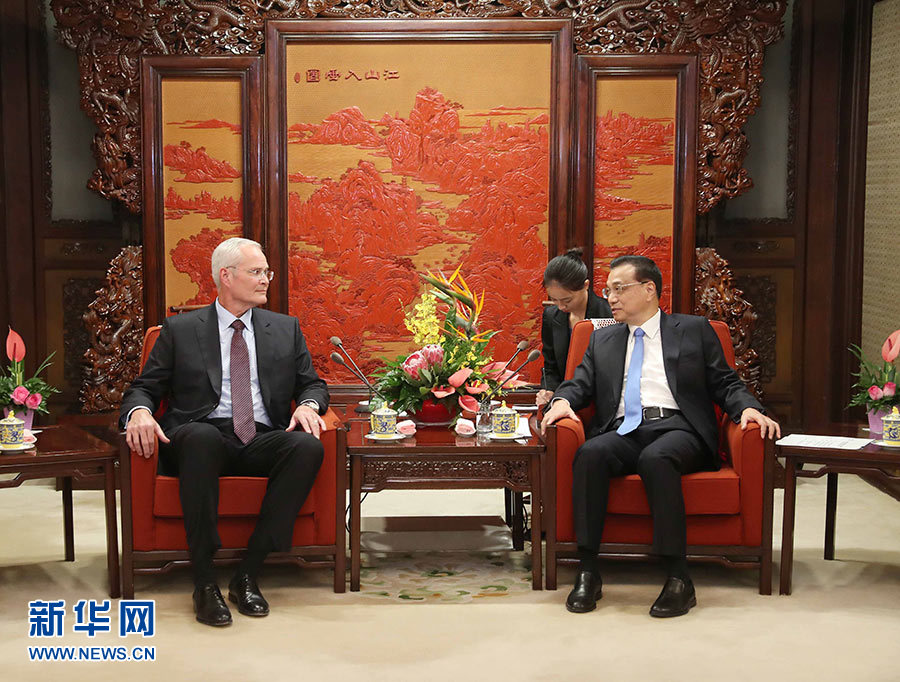 9月7日,國務院總理李克強在北京中南海紫光閣會見美國??松梨诠径麻L兼首席執行官伍德倫。 新華社記者 劉衛兵 攝