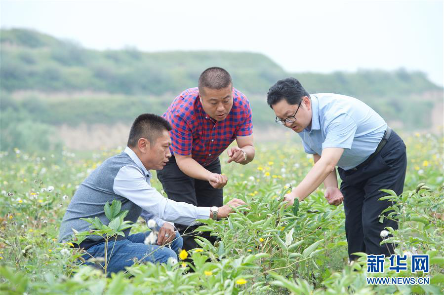 來自福建長樂的林錦云(中)在寧夏固原市河川鄉(xiāng)與福建對口支援農(nóng)業(yè)專家(右)交流牡丹種植技術(8月28日攝)。2014年,林錦云通過土地流轉方式,承包了河川鄉(xiāng)1.5萬畝荒山,打造油用牡丹生產(chǎn)基地。目前,林錦云種下的7600畝油用牡丹已經(jīng)開始產(chǎn)生效益,公司已就近吸納村民300多人就業(yè),其中建檔立卡貧困戶39戶,人均年收入2萬多元。? 新華社記者姜克紅攝