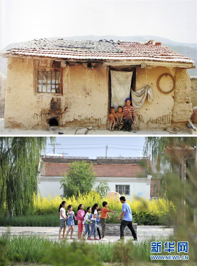 拼版照片:上圖為寧夏銀川市永寧縣閩寧鎮(zhèn)建設初期簡易的土坯房(資料照片);下圖為8月17日,孩子們在閩寧鎮(zhèn)原隆村一休閑廣場上玩耍(新華社記者劉軍喜攝)。? 新華社發(fā)
