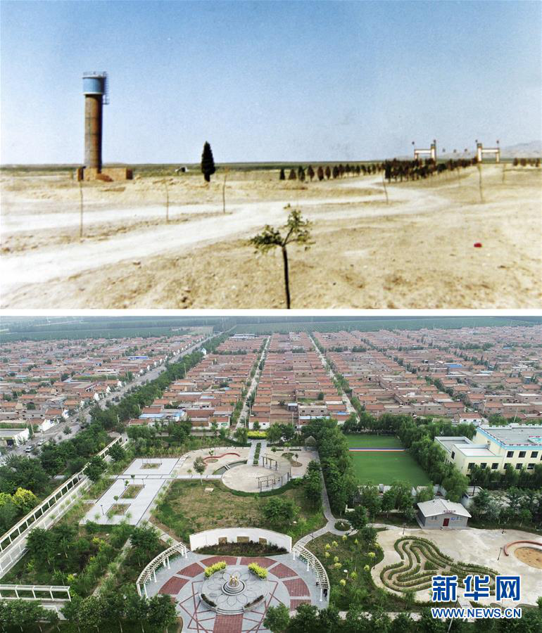 拼版照片:上圖為寧夏銀川市永寧縣閩寧鎮(zhèn)建設初期的資料照片;下圖為8月17日無人機拍攝的寧夏銀川市永寧縣閩寧鎮(zhèn)原隆村(新華社記者王鵬攝)。受益于福建、寧夏多層次、多形式、寬領域、全方位的扶貧協(xié)作,閩寧鎮(zhèn)這片曾經(jīng)的戈壁荒灘,被建設成現(xiàn)代化的生態(tài)移民示范鎮(zhèn)。6萬多名曾經(jīng)生活在西海固貧困山區(qū)的農(nóng)民陸續(xù)走出大山搬入閩寧鎮(zhèn),通過移民搬遷走上了脫貧致富之路。 新華社發(fā)