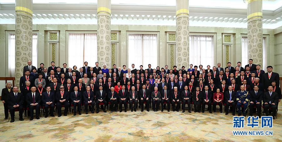 在《春天的故事》樂曲聲中,習近平等為獲得改革先鋒稱號、中國改革友誼獎章人員代表頒獎。