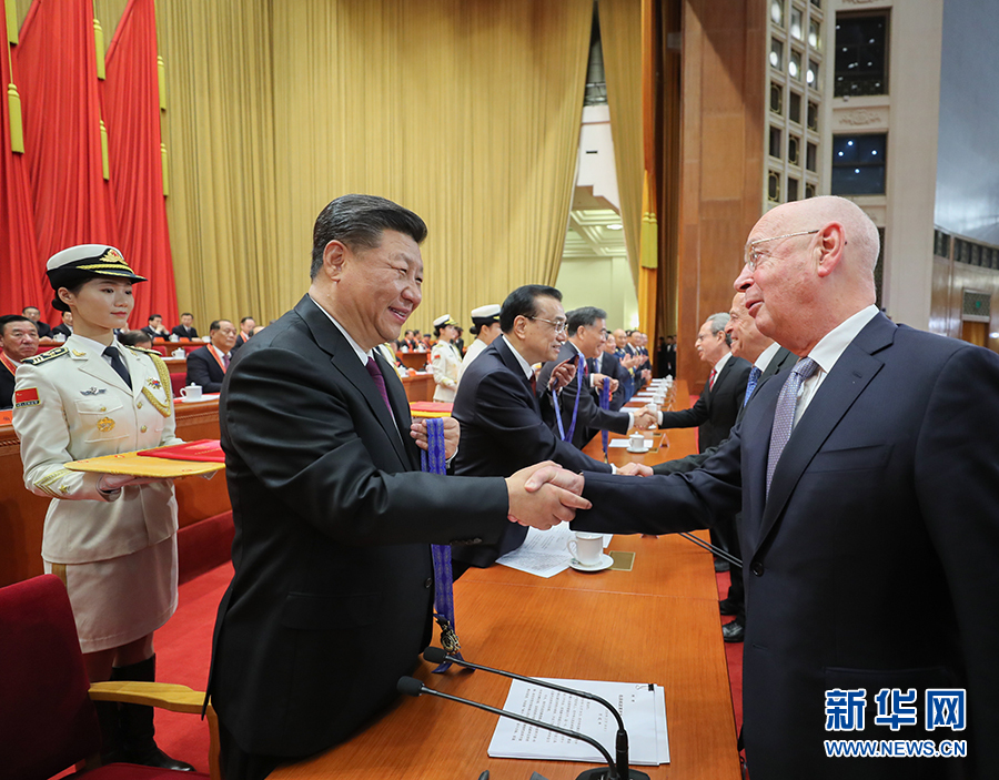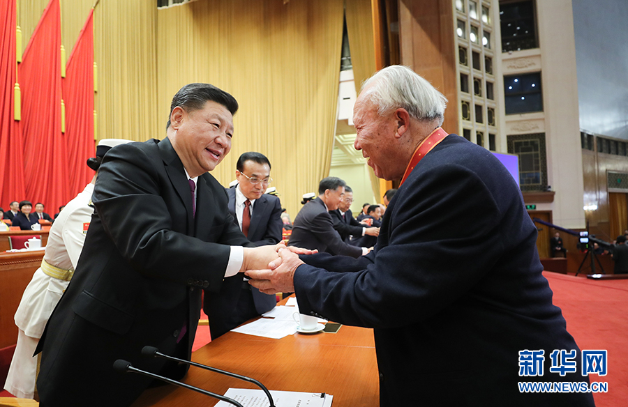 12月18日,慶祝改革開放40周年大會在北京人民大會堂隆重舉行。中共中央總書記、國家主席、中央軍委主席習近平在大會上發表重要講話。這是習近平等為獲得中國改革友誼獎章人員代表頒獎。 新華社記者 鞠鵬 攝