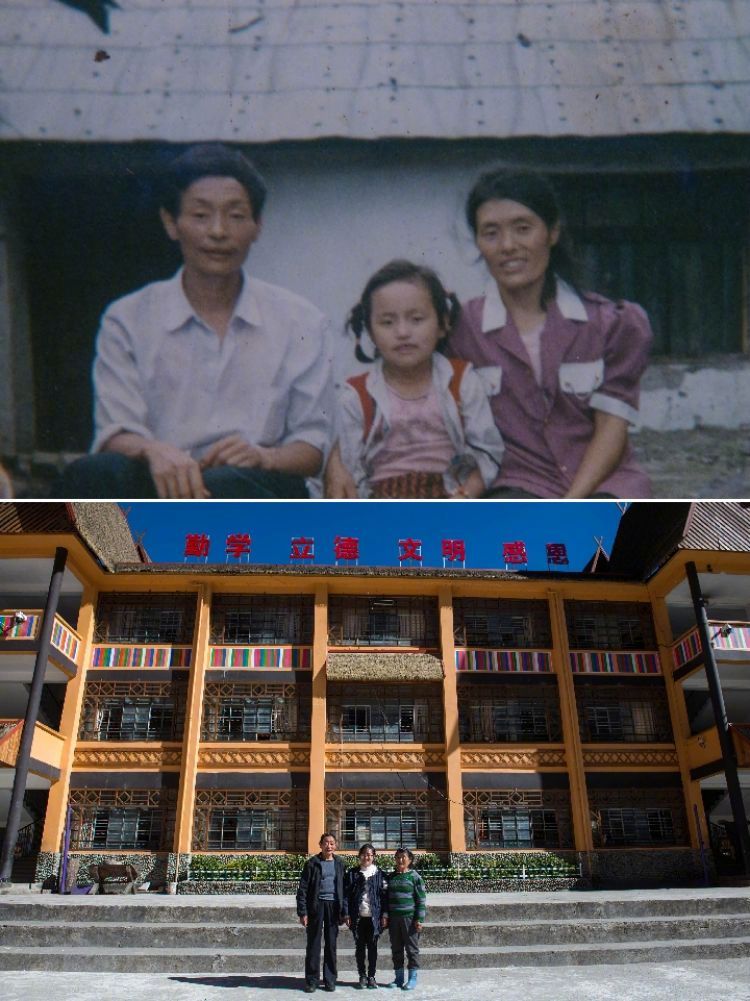 拼版照片,上圖:1993年在獨龍江鄉小學拍攝的獨龍族群眾高德生、高瓊先和黎英(從左到右)一家三口(資料照片);下圖:2016年11月23日在獨龍江鄉中心小學拍攝的獨龍族群眾高德生、高瓊先和黎英一家(從左到右)