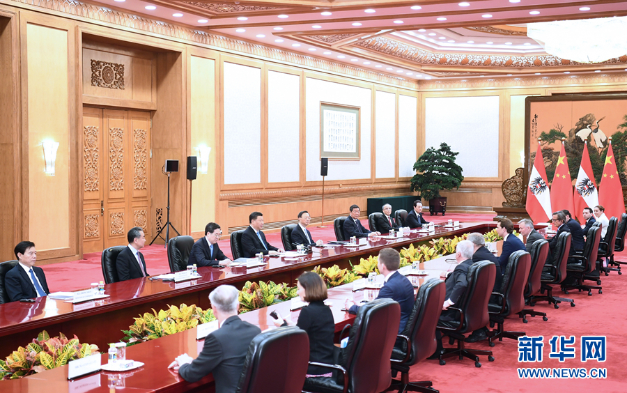 習近平指出,中方高度重視發展中奧關系。兩國友好戰略伙伴關系不斷得到充實。中奧合作潛力巨大,前景廣闊。雙方要堅持平等相待、相互尊重,不斷將雙邊關系推向新高度。要為加強兩國人文交流搭建更多平臺,促進兩國民心相通。中方歡迎奧方積極參與共建“一帶一路”和“16+1合作”,贊賞奧方對中國投資展現的開放姿態,歡迎奧地利企業抓住中國新一輪擴大開放帶來的機遇。