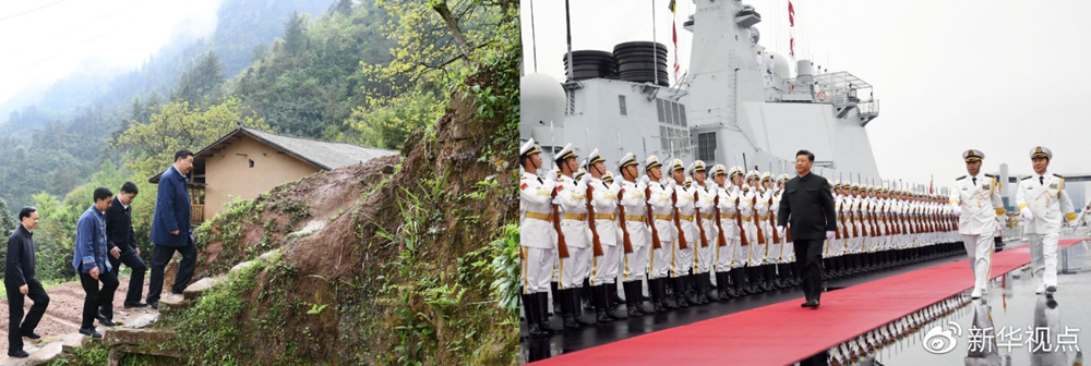 左圖為4月15日下午,在重慶石柱土家族自治縣中益鄉華溪村,習近平踏著濕滑的石階登上陡坡,前往貧困戶譚登周家看望(謝環馳攝);右圖為4月23日,習近平出席慶祝人民海軍成立70周年海上閱兵活動(李剛攝)