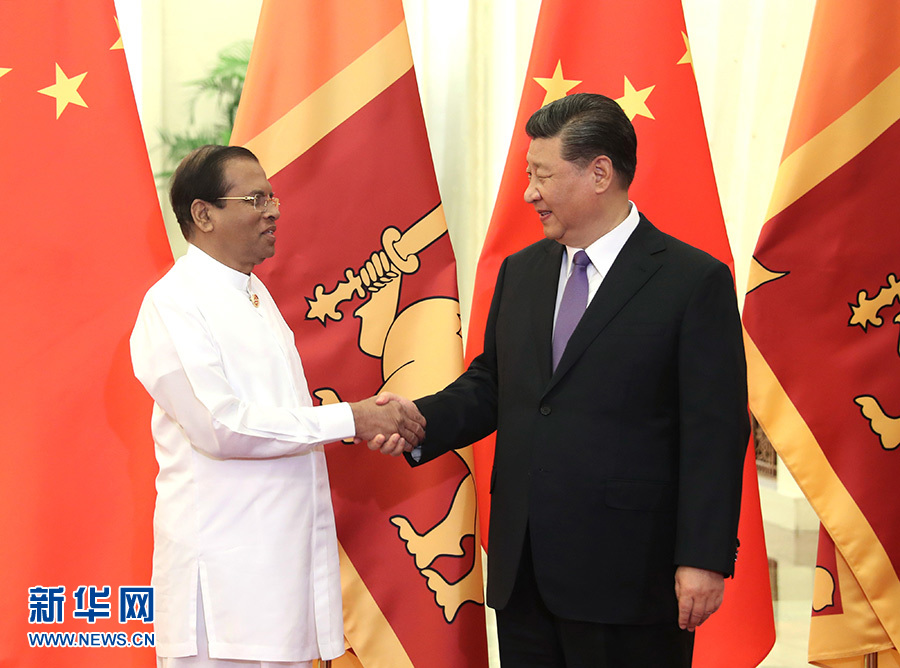 5月14日,國家主席習(xí)近平在北京人民大會(huì)堂會(huì)見來華出席亞洲文明對話大會(huì)的斯里蘭卡總統(tǒng)西里塞納。 新華社記者 姚大偉 攝