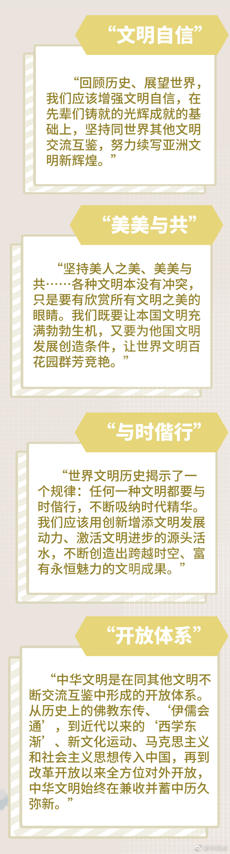 總結(jié)亞洲輝煌的文明成果,闡釋中華文明深刻內(nèi)涵,介紹不同文明“相處之道”,并提出亞洲人民三個期待和加強世界上不同國家、不同民族、不同文化交流互鑒的四點主張……