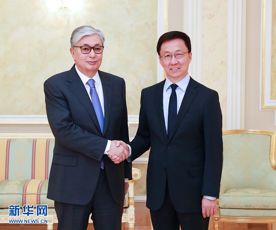 在會見托卡耶夫時,韓正首先轉(zhuǎn)達(dá)了習(xí)近平主席對托卡耶夫總統(tǒng)的親切問候。韓正說,在兩國元首的戰(zhàn)略引領(lǐng)和親自推動下,中哈全面戰(zhàn)略伙伴關(guān)系快速發(fā)展,雙方政治互信日益加深,各領(lǐng)域合作處于歷史最好水平,在地區(qū)乃至全世界樹立了睦鄰友好、互利共贏的典范。上個月習(xí)近平主席同納扎爾巴耶夫首任總統(tǒng)舉行了富有成果的會晤,向他頒授中華人民共和國“友誼勛章”,向國際社會展現(xiàn)了中哈關(guān)系的高水平和特殊性。共建“一帶一路”已成為中哈合作主線,雙方在發(fā)展戰(zhàn)略對接、合作機(jī)制建設(shè)、重大項目推進(jìn)等方面碩果累累。中方愿與哈方一道,繼續(xù)深化絲綢之路經(jīng)濟(jì)帶與“光明之路”新經(jīng)濟(jì)政策對接,以產(chǎn)能、貿(mào)易、互聯(lián)互通、農(nóng)業(yè)、高技術(shù)、金融合作為優(yōu)先方向,不斷提升中哈合作含金量,更好地造福兩國和兩國人民。中方祝愿哈方順利實施“2050戰(zhàn)略”,在國家發(fā)展事業(yè)中不斷取得新的輝煌成就。