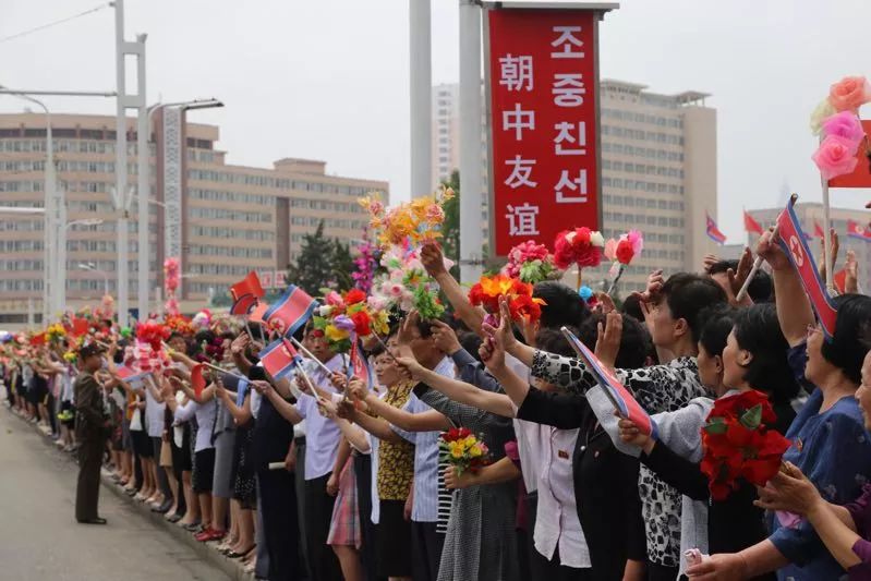 沿途數十萬群眾揮舞中朝兩國國旗和五彩繽紛的鮮花,熱情洋溢地高呼中朝友誼萬歲等口號。