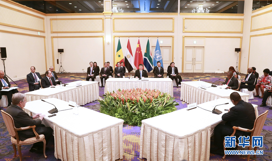 6月28日,國家主席習近平在大阪主持中非領導人會晤。中非合作論壇前任非方共同主席國南非總統拉馬福薩、非洲聯盟輪值主席國埃及總統塞西、中非合作論壇現任非方共同主席國塞內加爾總統薩勒和聯合國秘書長古特雷斯出席。 新華社記者 龐興雷 攝