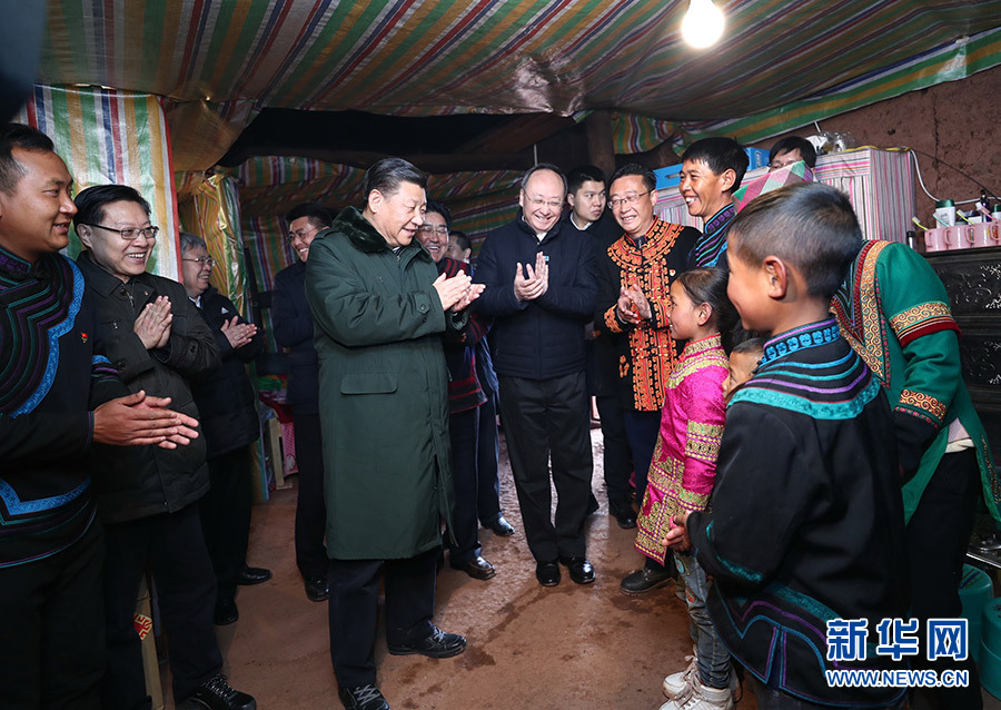 2018年2月11日,農歷春節來臨之際,習近平在四川涼山彝族自治州昭覺縣三岔河鄉三河村貧困戶吉好也求家中看望,聽10歲小女孩吉好有果唱《國旗國旗真美麗》。 新華社記者 鞠鵬 攝
