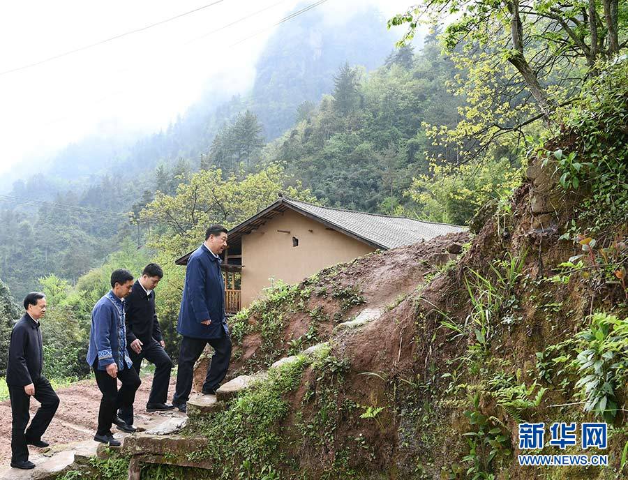 2019年4月15日,在重慶石柱土家族自治縣中益鄉華溪村,習近平踏著濕滑的石階登上陡坡,前往貧困戶譚登周家看望。新華社記者 謝環馳 攝