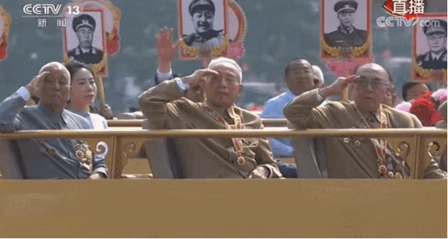 ?一曲《紅旗頌》奏響,當“致敬方陣”的禮賓車上,老一輩黨和國家、軍隊領導人親屬代表,老一輩建設者和親屬代表,新中國成立前參加革命工作的老戰士,老一輩軍隊退役英模、民兵英模和支前模范代表等從天安門前經過時,全場所有人自發起立,向英雄們致以崇高的敬意。 ?