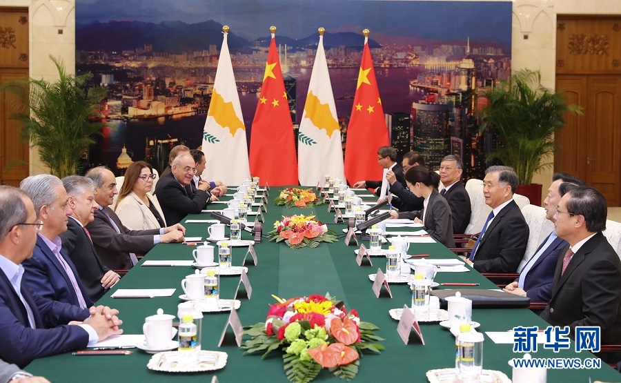11月8日,全國政協(xié)主席汪洋在北京人民大會堂會見塞浦路斯議長西盧里斯。 新華社記者 鞠鵬 攝