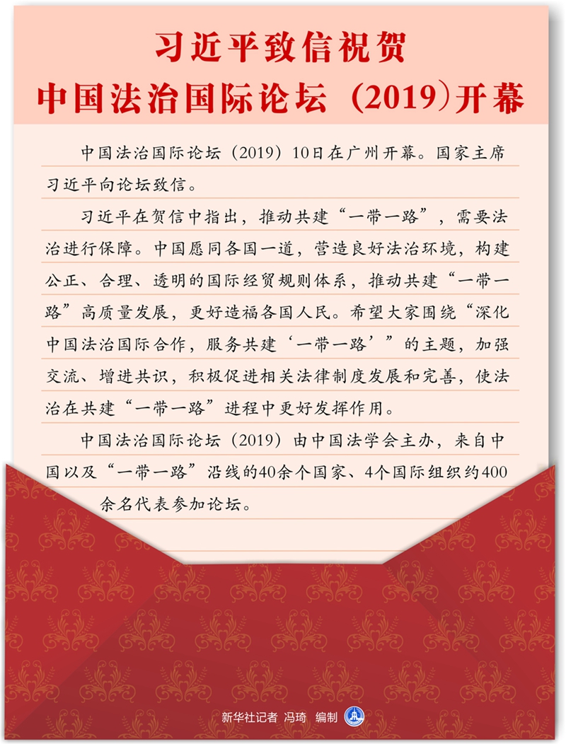 圖表:習(xí)近平致信祝賀中國(guó)法治國(guó)際論壇(2019)開幕 新華社記者 馮琦 編制。