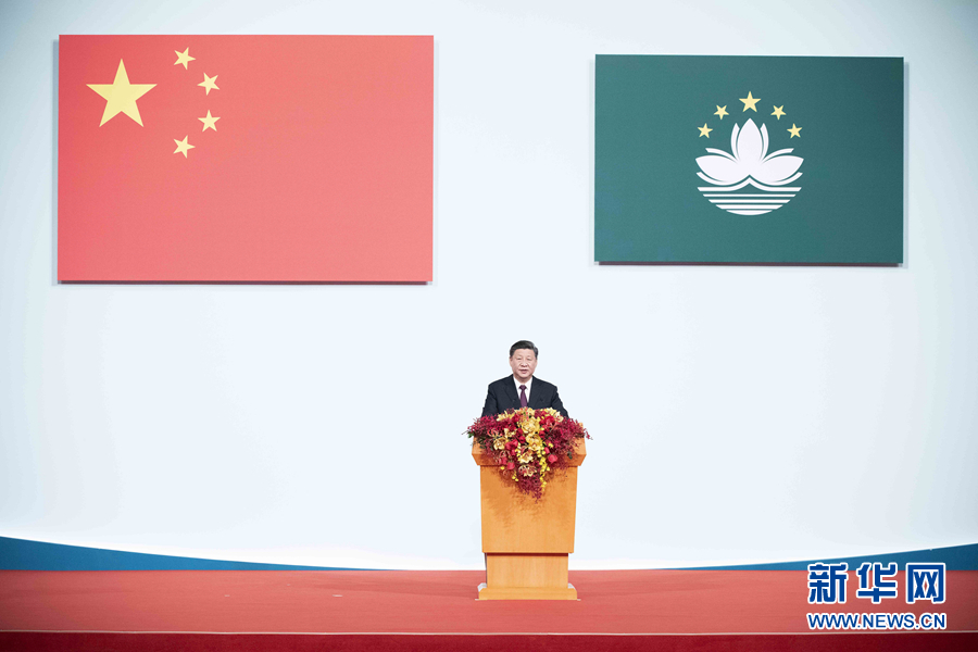在熱烈的掌聲中,習近平發表了重要講話。他首先代表中央政府和全國各族人民,向全體澳門居民表示誠摯的問候;向新就任的澳門特別行政區第五任行政長官賀一誠先生和第五屆政府主要官員、行政會委員,表示熱烈的祝賀;向所有關心、支持澳門發展的海內外同胞和國際友人,表示衷心的感謝。
