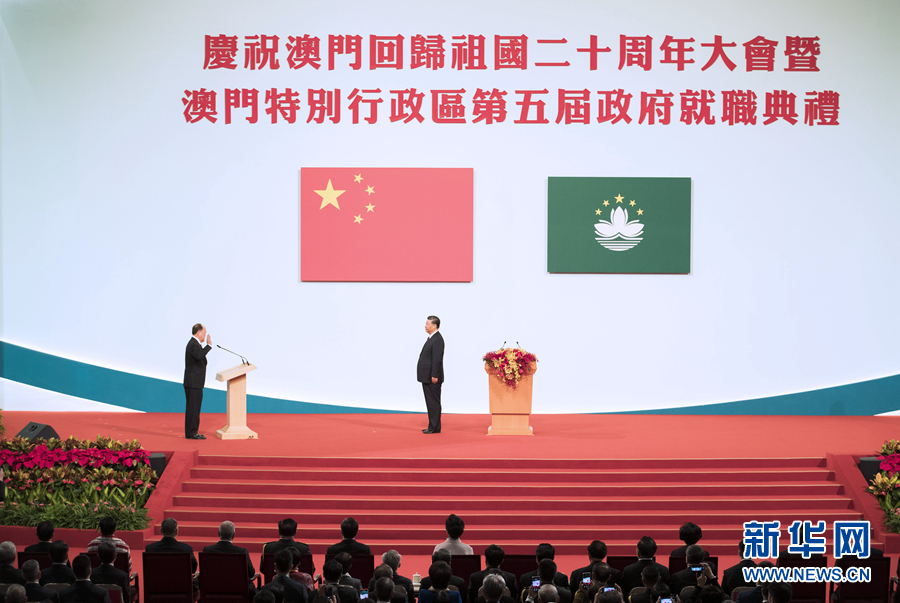 12月20日,慶祝澳門回歸祖國20周年大會暨澳門特別行政區第五屆政府就職典禮在澳門東亞運動會體育館隆重舉行。中共中央總書記、國家主席、中央軍委主席習近平出席并發表重要講話。 新華社記者 鞠鵬 攝