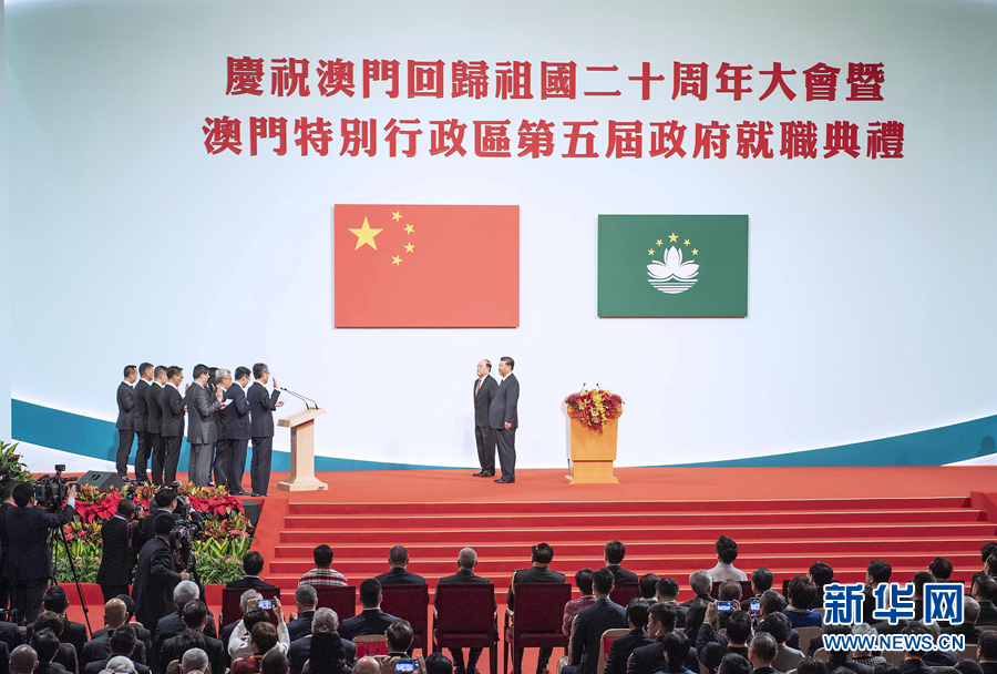 12月20日,慶祝澳門回歸祖國20周年大會暨澳門特別行政區第五屆政府就職典禮在澳門東亞運動會體育館隆重舉行。中共中央總書記、國家主席、中央軍委主席習近平出席并發表重要講話。 新華社記者 李濤 攝