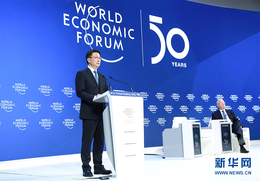 當(dāng)?shù)貢r(shí)間1月21日,中共中央政治局常委、國(guó)務(wù)院副總理韓正出席達(dá)沃斯世界經(jīng)濟(jì)論壇2020年年會(huì),發(fā)表題為“共建開放型世界經(jīng)濟(jì) 推動(dòng)全球可持續(xù)發(fā)展”的致辭。 新華社記者 龐興雷 攝