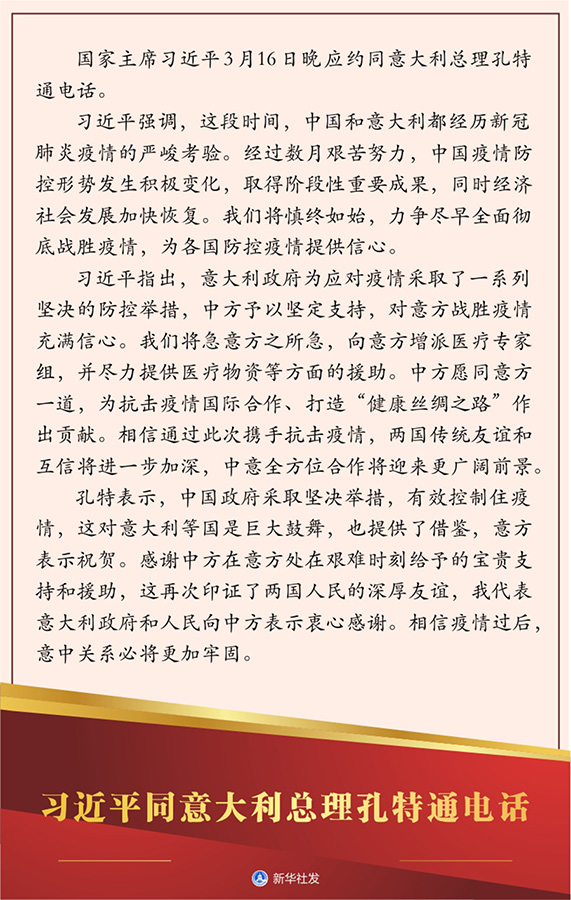 習(xí)近平指出,意大利政府為應(yīng)對疫情采取了一系列堅決的防控舉措,中方予以堅定支持,對意方戰(zhàn)勝疫情充滿信心。我們將急意方之所急,向意方增派醫(yī)療專家組,并盡力提供醫(yī)療物資等方面的援助。中方愿同意方一道,為抗擊疫情國際合作、打造“健康絲綢之路”作出貢獻(xiàn)。相信通過此次攜手抗擊疫情,兩國傳統(tǒng)友誼和互信將進(jìn)一步加深,中意全方位合作將迎來更廣闊前景。