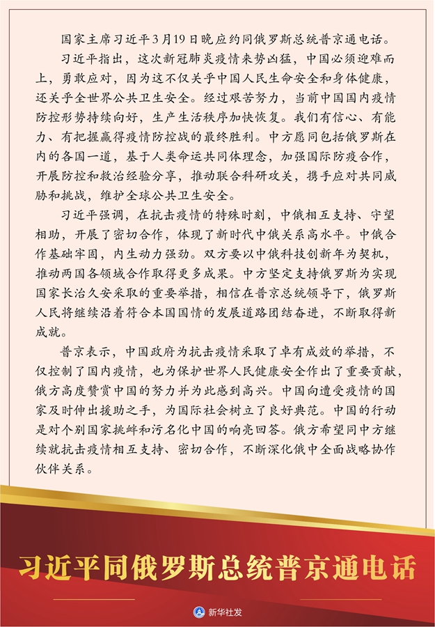 習近平指出,這次新冠肺炎疫情來勢兇猛,中國必須迎難而上,勇敢應對,因為這不僅關乎中國人民生命安全和身體健康,還關乎全世界公共衛生安全。經過艱苦努力,當前中國國內疫情防控形勢持續向好,生產生活秩序加快恢復。我們有信心、有能力、有把握贏得疫情防控戰的最終勝利。中方愿同包括俄羅斯在內的各國一道,基于人類命運共同體理念,加強國際防疫合作,開展防控和救治經驗分享,推動聯合科研攻關,攜手應對共同威脅和挑戰,維護全球公共衛生安全。
