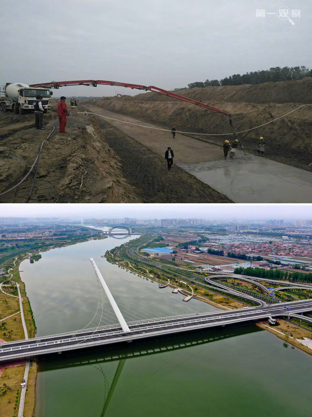 ?↑拼版照片:上圖為2017年10月5日拍攝的太原市汾河城區段治理美化三期工程施工場景(資料照片);下圖為2020年4月29日無人機拍攝的太原市汾河兩岸景色(新華社記者 曹陽 攝)。